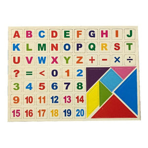 Abecedario (26 letras)+Números y simbolos matematicos (28 en total)+Tangrama (7 piezas) de madera con imán.