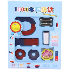 Contiene: 2 imanes redondos de 2cm, 1 imán forma herradura de 4x4cm, 1 imán barra de 4,5cm, 2 imanes ovalados de 2,5cm, 1 carrete de hilo y 2 clip