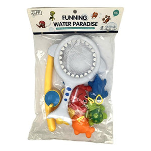 Pesca milagrosa compuesto por 7 piezas que incluye 1 red de pesca con forma de tiburón plástica, medidas 25 x 18 x 2,5 cm, 1 can~a de pescar plástica, medidas 29 x 6 cm y 5 figuras de animales marinos flotantes de goma como estrella, tortuga, cangrejo, ballena y foca, medidas 8 x 9 cm.