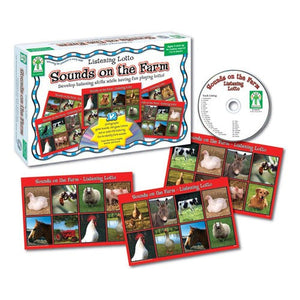 ¡Ayuda a los niños a aprender a escuchar atentamente y a hacer conexiones entre los sonidos y las cosas o criaturas que hacen esos sonidos con los sonidos de la lotería de escucha en la granja!