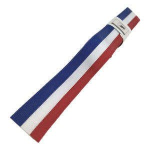 Cinta Tricolor de tela 2.5 cm de ancho con los colores de la bandera de Chile. Útil para decoración de Fiestas Patrias, bandas, escarapelas, colgantes, manualidades, cinturones huasos, etc.