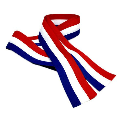 Cinta Tricolor Mediana de 6 cm de ancho con los colores de la bandera de Chile. Útil para decoración de Fiestas Patrias, bandas, escarapelas, colgantes, manualidades, cinturones huasos, etc.