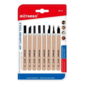 Ideales para el trabajo de tallado en madera. Gubias de acero con mango de madera resistente. 8 puntas de trabajo para distintas superficies o ángulos.