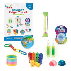 Cada kit incluye 1 tubo sensorial como reloj de arena, 1 cápsula de espuma para moldear, 1 pelota antiestrés como globo terráqueo, 2 varitas fluorescentes, 100 eslabones para armar cadenas, 20 cubos para armar, 2 gomas saltarinas, 1 resorte con colores de arcoíris.