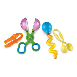 Set de 4 herramientas para el agua y arena, de material plástico resistente, compuesto por 1 botella exprimible, 1 ruleta, 1 gotero ondulado y 1 cuchara.
