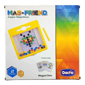 Contiene un tablero con fichas multicolor para combinar, un lápiz magnético para poder deslizar las fichas y 7 tarjetas con 14 ejercicios para desarrollar.