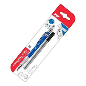 Portaminas cuerpo redondo metálico con pulsador, clip y virola cromados. Con ventanilla ajustable con indicador de la graduación de la mina. Afilaminas y goma de borrar en el pulsador.