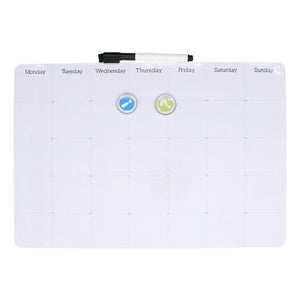 Una práctica pizarra metálica con cuadricula para usar como calendario semanal o mensual, la cuadricula está subdividida en 35 espacios. Incluye un plumón con borrador en la tapa + 2 imanes redondos.