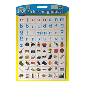 Pizarra magnética con medidas 62.5 x 40 cms. que incluye 160 fichas magnéticas compuesto por abecedario mayúscula, minúscula y acentuación, animales y objetos, con medidas 4,3 x 5 cm.