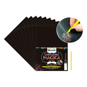 Ideal para trabajos escolares, manualidades, arte, etc... Raspa, dibuja y diviértete. Cartulina mágica + raspador. Contiene 10 hojas negras (fondo de arcoíris). Tamaño: A4 21 x 29,7cms.