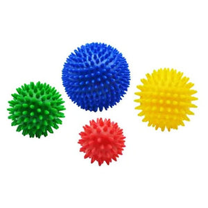 Set compuesto por 4 pelotas sensoriales, material de goma con textura de erizo en diferentes tamaños. Ideal para el trabajo con niños o personas con sensibilidad reducida.