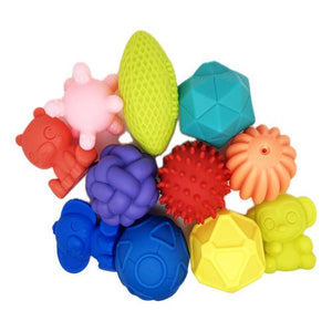 Set de 10 pelotas de goma blanda diferentes texturas y colores con medidas entre 7,5 y 8 cm. Fortalece la estimulación sensorial, coordinación y motricidad .