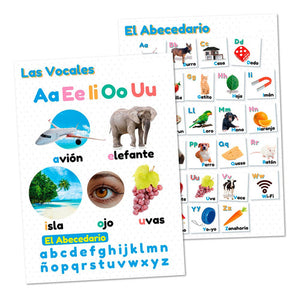 Por un lado es el abecedario con imágenes y por el otro las vocales con imágenes.