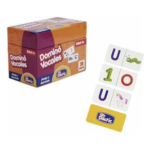 Juego dominó vocales de cartón. Permite al niño identificar el sonido inicial de las vocales asociándolas con la imagen correspondiente. Además de iniciarlos en actividades grupales con reglas.