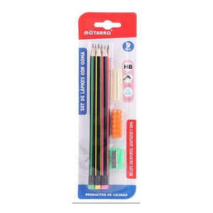 Set incluye 6 lápices grafito + 1 sacapuntas + 1 goma de espuma ergonómica + 1 tapa plástica.